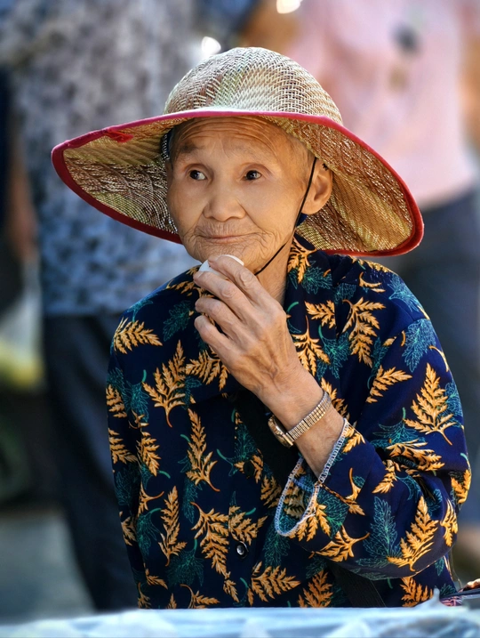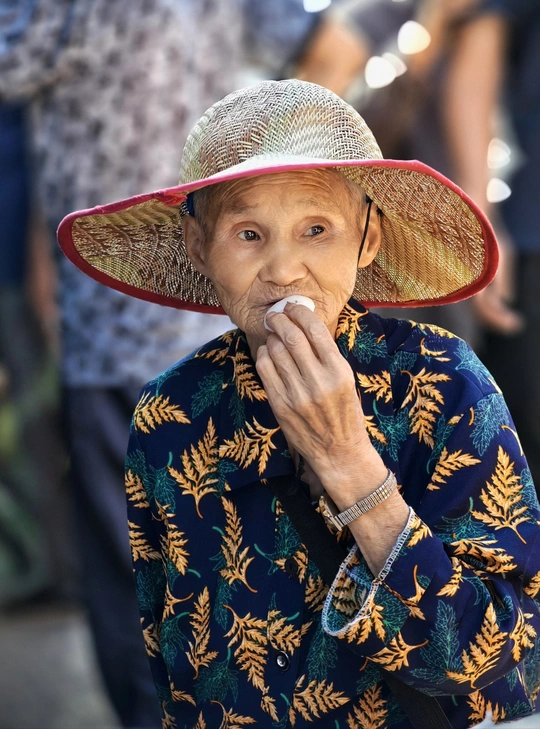 市井之间,温情满满。老奶奶手拿糕点,在乡镇集市赶场的喧嚣中享受一份简单的快乐。