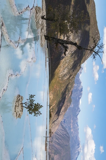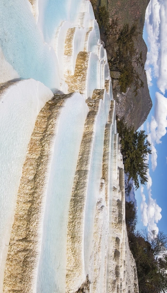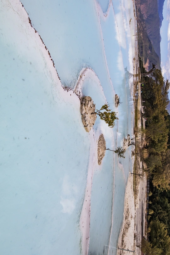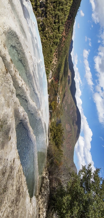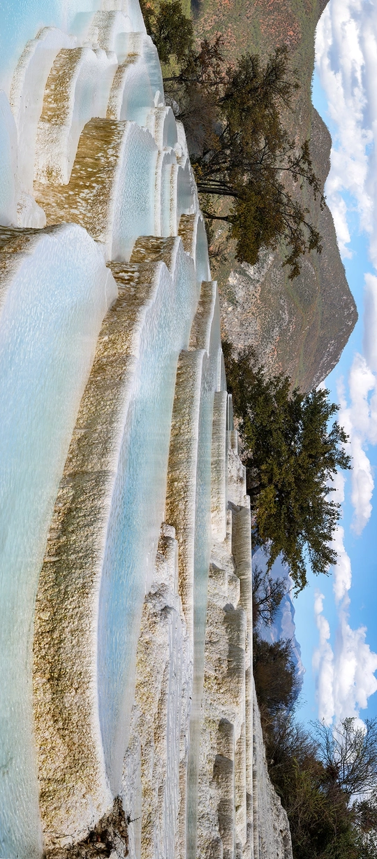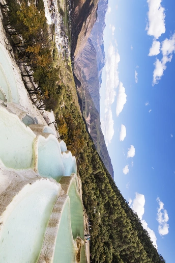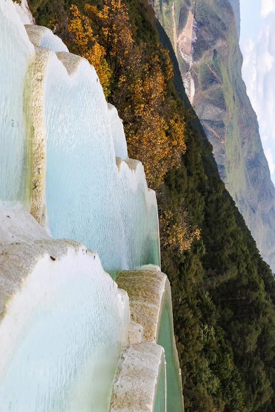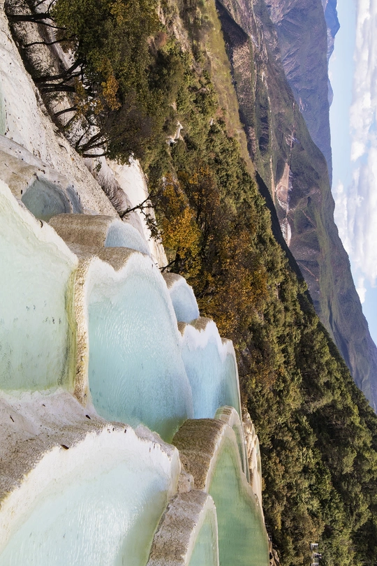 白水台位于香格里拉县城东南的三坝乡白地村,距县城101公里,海拔2380米,是纳西族东巴教的发祥地。远处看去,青山掩映中的白水台造型真的就像层层梯田,在阳光照耀下,又仿若摄影作品中凝固的瀑布一般。一脚踏在白色的石阶上,说不出的泌凉畅快。 纳西语称白水台为"释卜芝"意为逐渐长大的花,白水台有"仙人遗田"的美称。步临台地,但见白水台层层叠叠,宛若片片斜月散落人间,又似纳西少女的银饰,叠饰成无数的银环,朝晕夕照,银光散射给人以抛金削玉般的清新。左侧,一泉台形似一弯新月,清泉盈盈四溢,相传是仙女梳妆的地方。泉台左下侧一石穹窿,洁白如玉,形如一怀孕女子,是当地群众供奉生殖神的地方,白水台不仅是一个风景秀丽的地方,又是纳西族东巴教的发源地中心,宗教活动和民族节目的活动之处。
