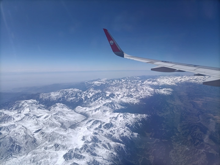 飞机飞往乌鲁木齐,在天山山脉上空掠过,山顶连绵的皑皑白雪让人沉醉。