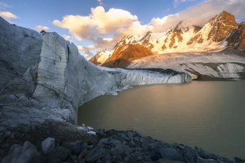 新疆的博格达峰,虽然海拔高度只有5445米,但因为所处纬度高、小气候独特,所以依旧孕育出庞大的令人惊叹的冰川,冰川末端甚至低至海拔3600米,如城墙一般,拱卫着王座形状的山峰和脚下的冰湖。