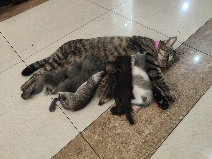 小区里来了一只流浪猫,喂了它几次,竞然不走了,还生了6只小猫。