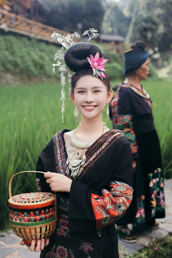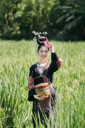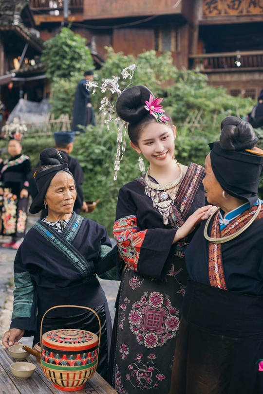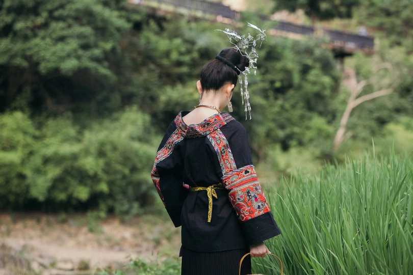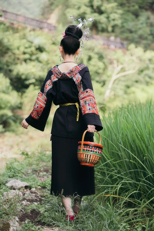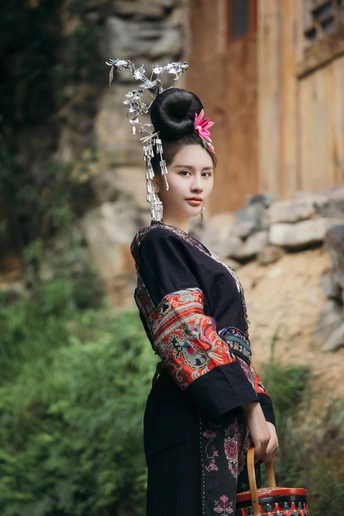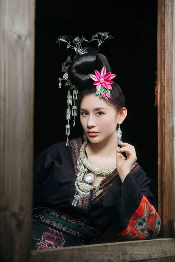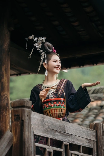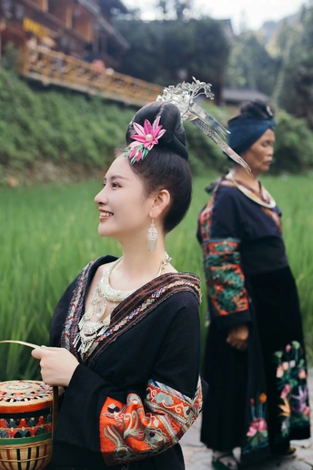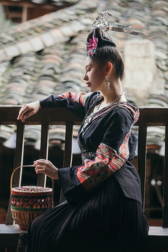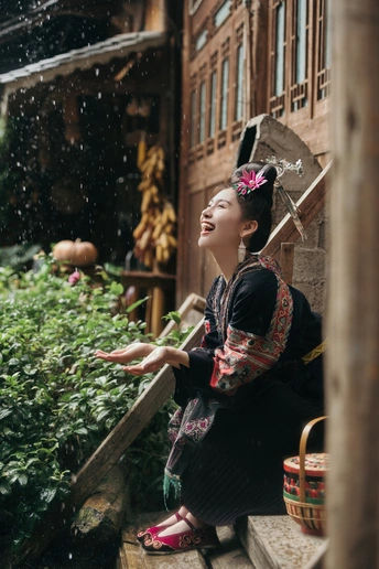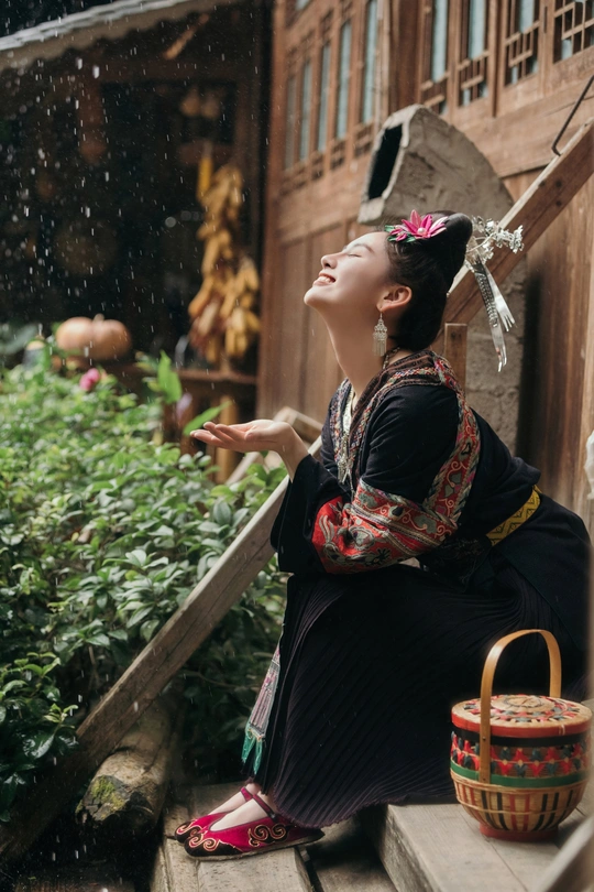 与山共生,与神灵同在,她们有着山地农耕的智慧和天地共生的信仰。 /贵州旅拍/郎德上寨/苗服写真 📷微博:倩小鱼zizi (很开心香香又一次和我拍摄重要的作品,也是此次贵州旅拍,另一套重要的民族服饰,苗服!我们没有选择戴最常见的银色头冠,而是顶髻加花的造型,更搭配这身好看的老苗服。很感谢是一位很温柔的阿姨出租给我们的!我们穿着这身老苗服,在稻田边行走,感受苗寨热情的拦门酒,和同样身着苗服的奶奶们待在一起,我喜欢那种有亲和力的温暖氛围。我们踏上吊脚楼的独特建筑结构,在美人靠的倚栏上勾画出身着苗服的倩影,我知道在这里其实是无数佝偻的女性身影,一辈子缝绣着手上的衣布,这里是她们眺望远方的家庭角落。这里的天气时而晴,时而雨,下雨的时刻,更有种千年来返璞归真的感觉。)