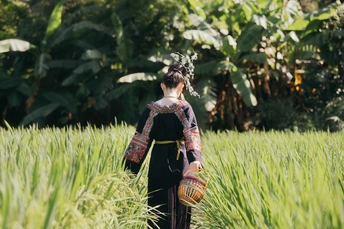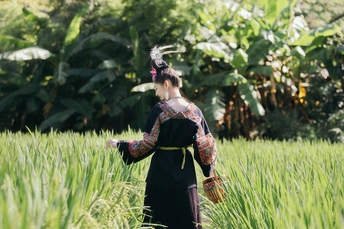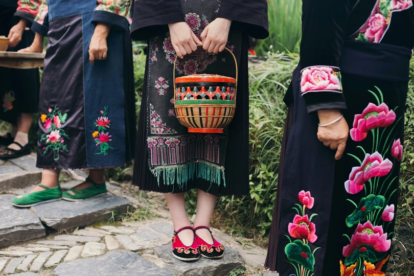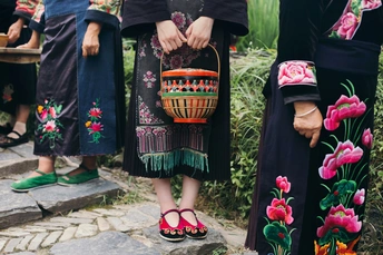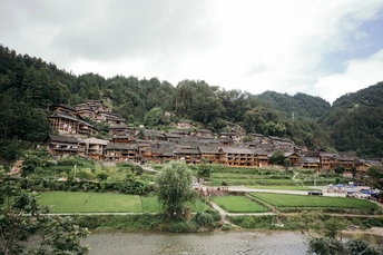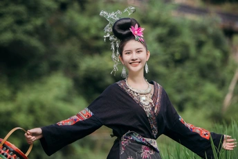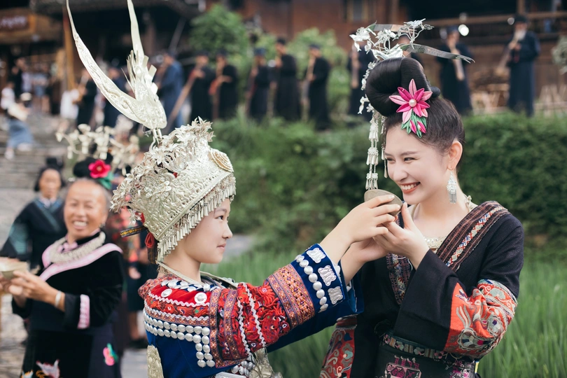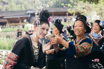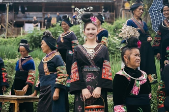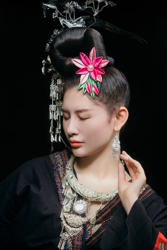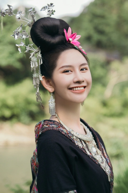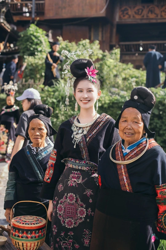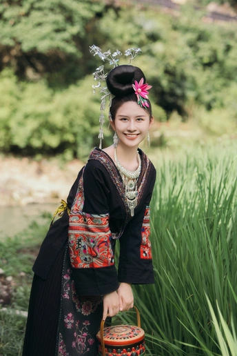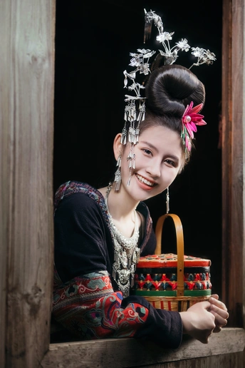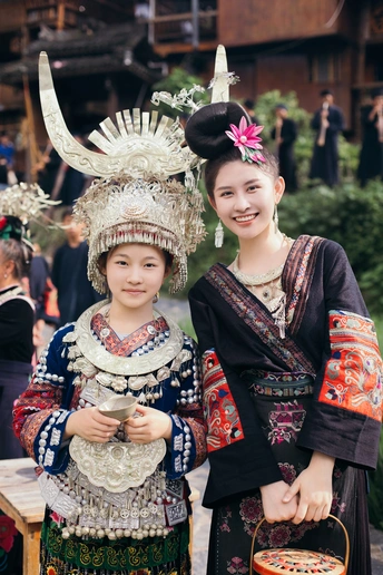 与山共生,与神灵同在,她们有着山地农耕的智慧和天地共生的信仰。 /贵州旅拍/郎德上寨/苗服写真 📷微博:倩小鱼zizi (很开心香香又一次和我拍摄重要的作品,也是此次贵州旅拍,另一套重要的民族服饰,苗服!我们没有选择戴最常见的银色头冠,而是顶髻加花的造型,更搭配这身好看的老苗服。很感谢是一位很温柔的阿姨出租给我们的!我们穿着这身老苗服,在稻田边行走,感受苗寨热情的拦门酒,和同样身着苗服的奶奶们待在一起,我喜欢那种有亲和力的温暖氛围。我们踏上吊脚楼的独特建筑结构,在美人靠的倚栏上勾画出身着苗服的倩影,我知道在这里其实是无数佝偻的女性身影,一辈子缝绣着手上的衣布,这里是她们眺望远方的家庭角落。这里的天气时而晴,时而雨,下雨的时刻,更有种千年来返璞归真的感觉。)