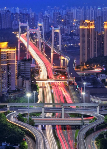 2024年6月30号,拍摄重庆市,魔幻8d城市。夜幕降临,华灯初上,川流不息的鹅公岩双桥车轨。