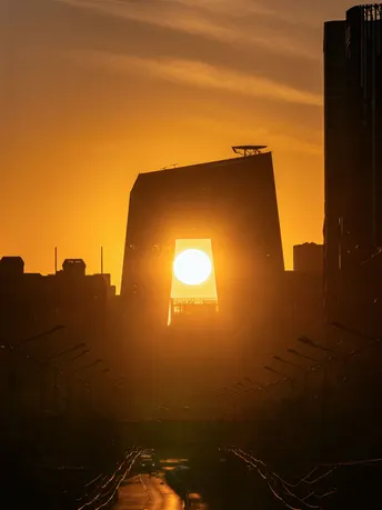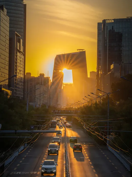 经典大裤衩悬日 春分或秋分太阳直射赤道 太阳从正东方日出到正西方日落 秋分前后落日刚好穿过中央电台大楼 早早到了机位蹲守,经过漫长的等待拍到这张图
