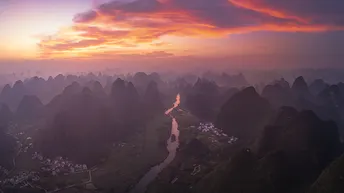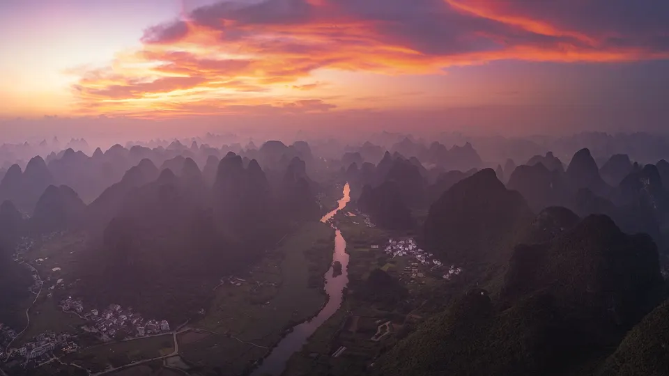 在遇龙河遇到的浪漫朝霞,遇龙河也如同一条红色的飘带落在桂林大地之间。
