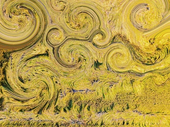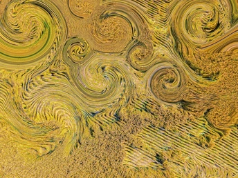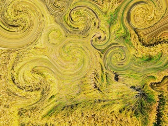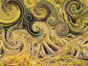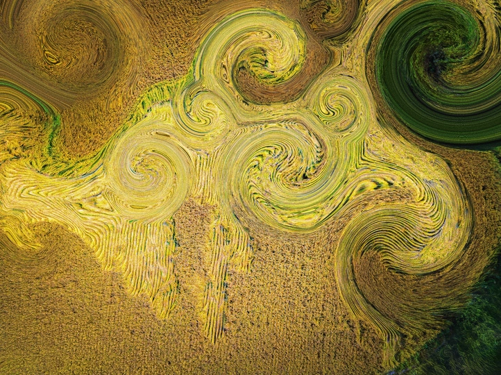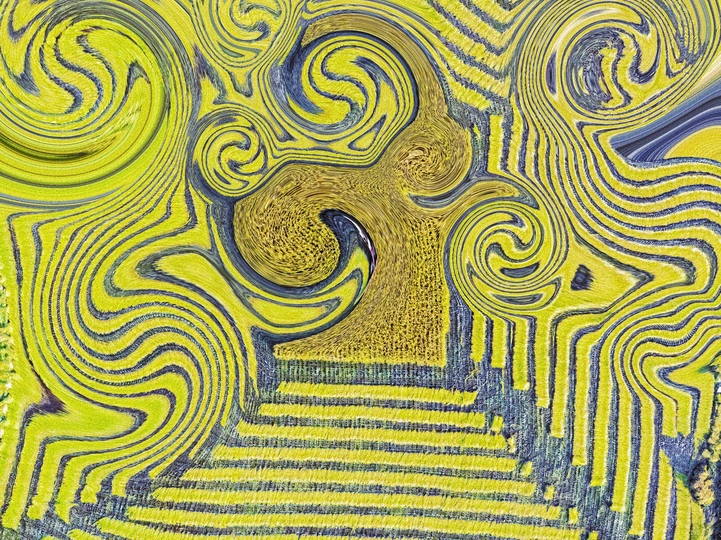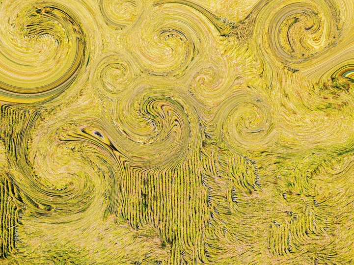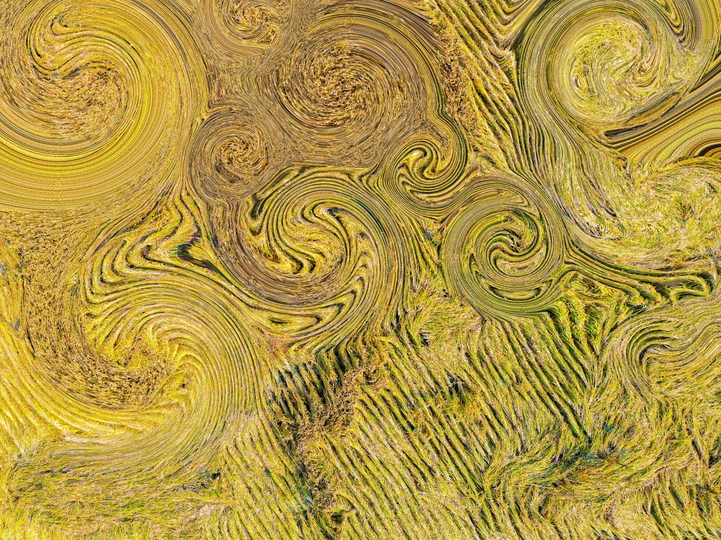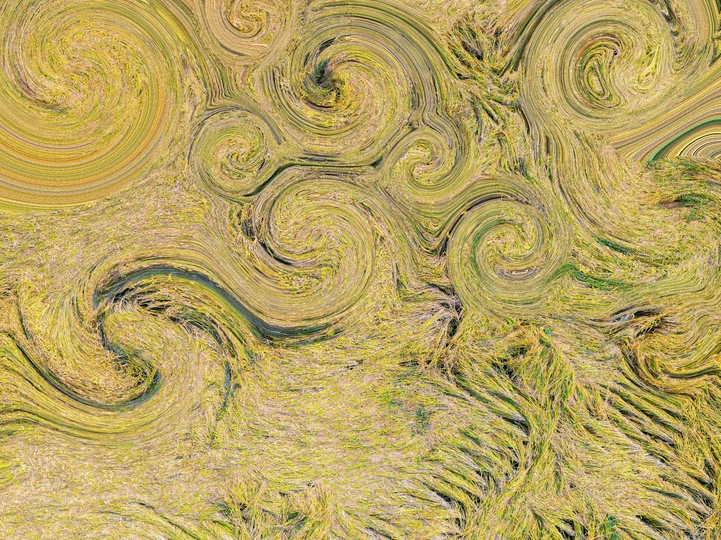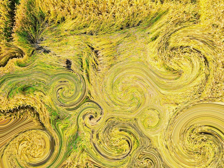 秋风吹过稻田间, 倒伏稻禾展画卷。 金浪翻涌似星灿, 仿若梵高笔下端