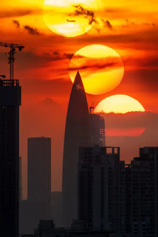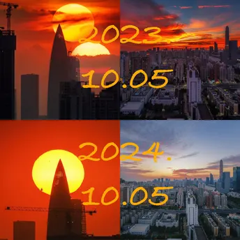 2023.10.05用巧摄规划了春笋顶日,但是爬楼高度估算错了,太阳偏了点。意外的是,当天由于台风的关系,出现了持续近一小时的世纪大烧。预谋了一年,今天再拍春笋顶日,虽然顶上了,但是太阳太偏低。然后又出现了意料之外的晚霞,可惜没有去年烧的猛烈和持久,拍完日落短短几分钟就烧没了。只能再期待2025.10.05的日落和晚霞了,明年春笋顶日更正,只是春笋周围的楼越起越高遮挡越来越多。去年今天的你在哪看日落和晚霞呢?今天又在哪看的呢?