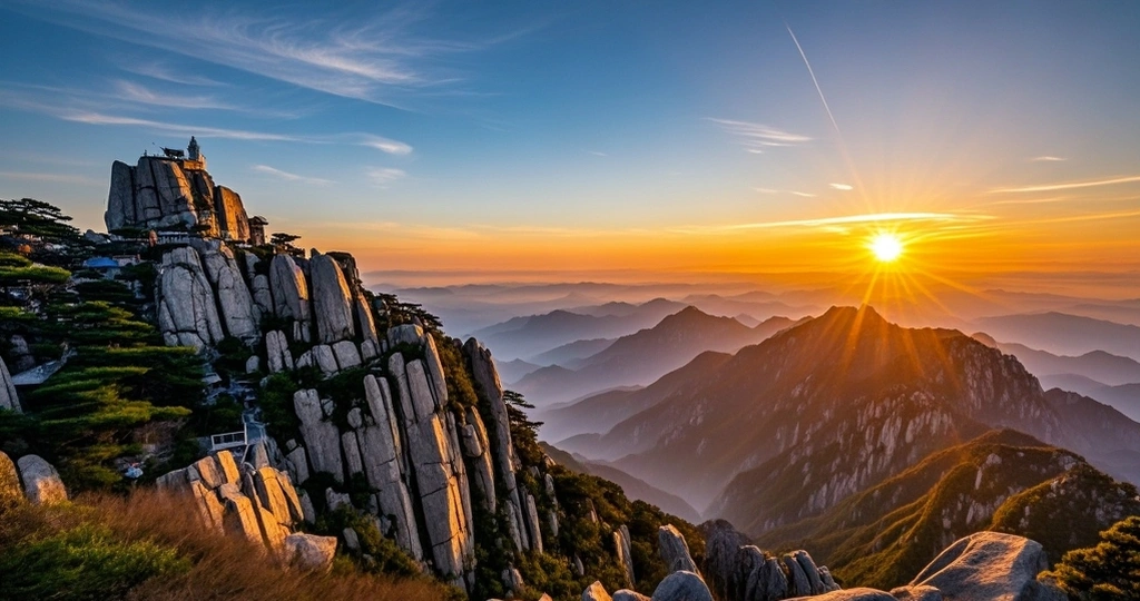 在这幅泰山日出的图片中,呈现出令人震撼的美景。 前景中,泰山的山体雄伟壮观,岩石嶙峋,纹理清晰可见。古老的松树屹立在山岩之间,苍劲挺拔,仿佛在诉说着岁月的故事。 远处,一轮红日从地平线喷薄而出,光芒万丈。金色的阳光洒在泰山之上,为山峦披上了一层璀璨的光辉。天空中,朝霞绚烂多彩,由橙红、粉红、金黄等色彩交织而成,如一幅巨大的画卷在天空中展开。 阳光渐渐照亮了周围的云海,云海如波涛般涌动,变幻莫测。有的地方如轻纱般飘动,有的地方如棉絮般堆积,给人一种如梦如幻的感觉。 整幅画面充满了生机与活力,展现出大