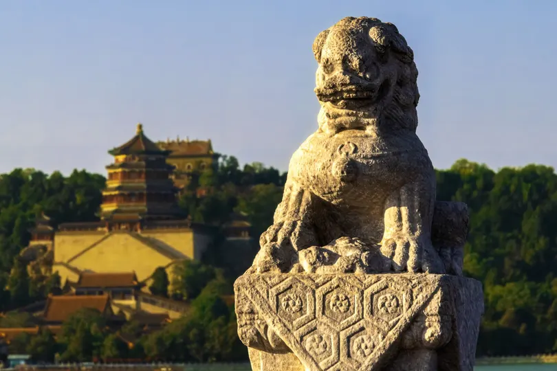 十七孔桥边,望柱石狮静默。 岁月在它们身上留下斑驳,却掩不住威严气魄。 目光投向远方,佛香阁高耸巍峨。 那是历史的杰作,承载着无数的传说。 石狮守望着湖水,仿佛在诉说过往的烟波。 佛香阁屹立于山巅,散发着神秘的光泽。 它们在时光中对望,见证着岁月的穿梭。 风拂过,湖水泛起涟漪,似在回应这古老的沉默。 石狮与佛香阁,共同绘就一幅壮丽的山河画卷,永不褪色。