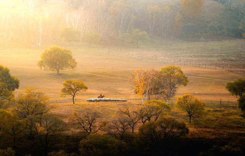 内蒙坝上草原乌兰布统秋色,夕阳下的牧羊人之归途。