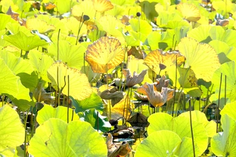 在夕阳的映照下,青城公园园心湖里金黄色的秋荷,在闪闪发光。