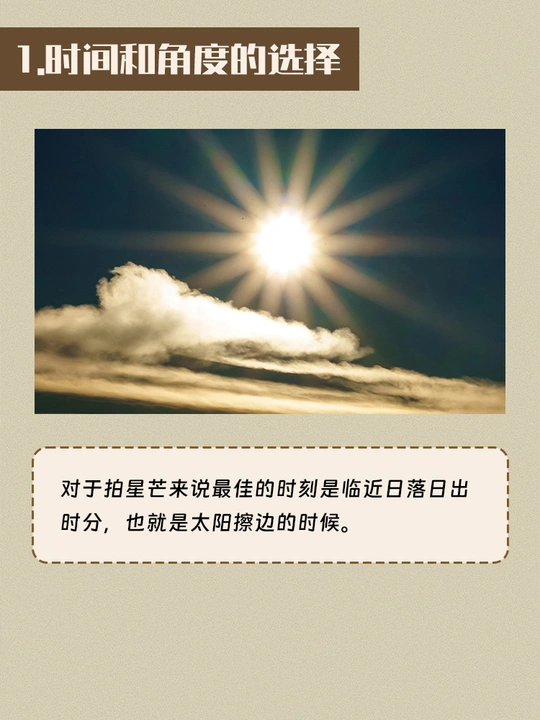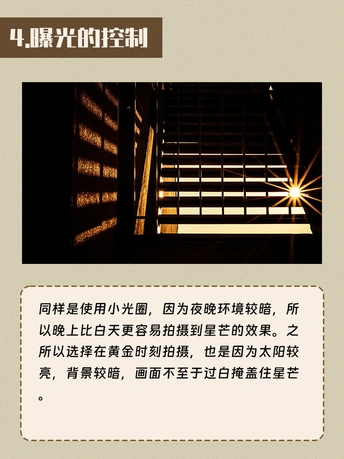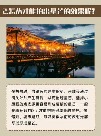 本文主要介绍了如何拍出星芒效果,包括最佳拍摄时机、镜头选择、光圈控制、曝光控制、星芒线的数量与光圈叶片的关系、镜头品质判断、长曝光拍摄、大光圈拍摄等。星芒效果的拍摄需要掌握光线的衍射原理,同时需要注意镜头和背景的协调。