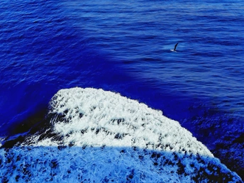 游轮行驶在一望无垠的太平洋中,偶尔有海鸥在游轮周边翱翔,成为游轮之外活的动物。当然,想像力丰富的话,也可以将那白色的浪花想像成海洋“巨兽”,而且还不断变化着身姿,仿佛也是活的一般。