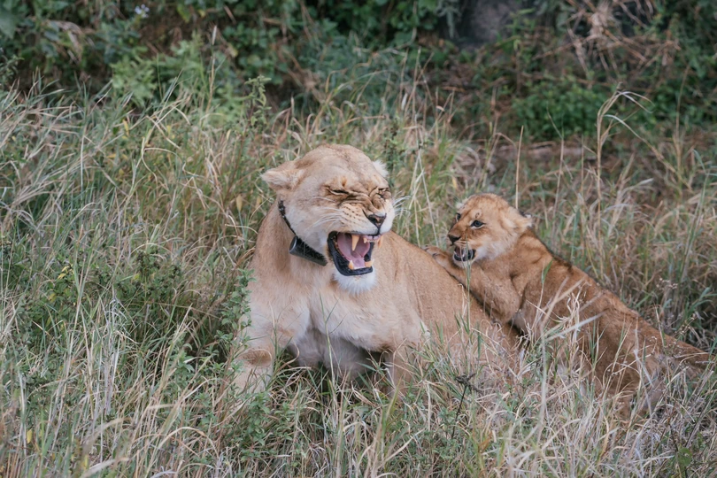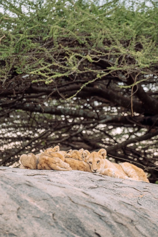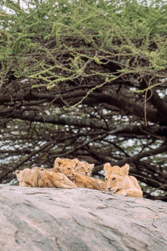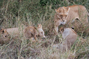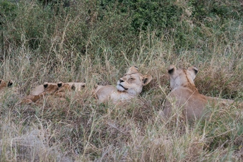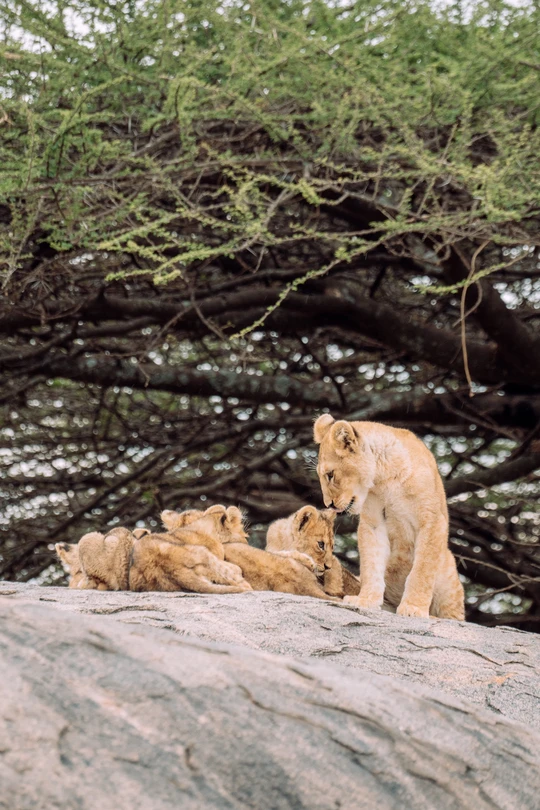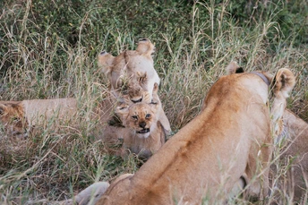 除了遇到懒散的雄狮联盟,我们在塞伦盖蒂中部也发现了一个3只雌狮子为首的大家庭,带着一帮未成年幼崽,一对小脑袋藏在草里,数了数至少有5只。这一家在草丛里休息,其中一只小狮子很活泼,不断地去骚扰三只成年狮子,妈妈和姨姨都烦了,全都呵斥他走开。我记得猫咪是只有高等级的才可以舔小弟,在狮子妈妈舔小狮子肚皮的时候,小狮子却也一直在舔着妈妈的脑袋。
