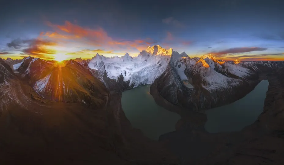 在阳光的照耀下,萨普神山的山峰闪烁着金色的光芒,如同一个美丽的神话世界。