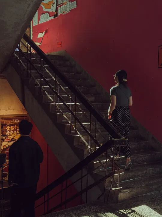一束光打在楼梯上,一男一女近在咫尺各自奔向