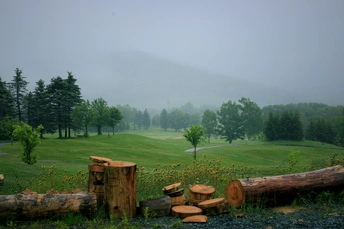 六月的北海道美瑛町的夏晨,濛濛的雨雾象白纱覆盖了远处的山峦,宁静、凉爽、润泽。