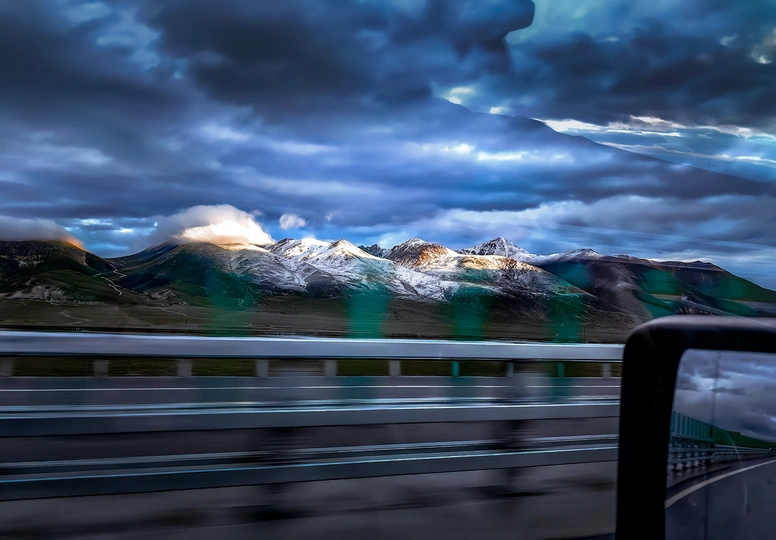 快速行驶的车辆眺望远处霞光笼罩的雪山,匆匆一瞥,转瞬即过。