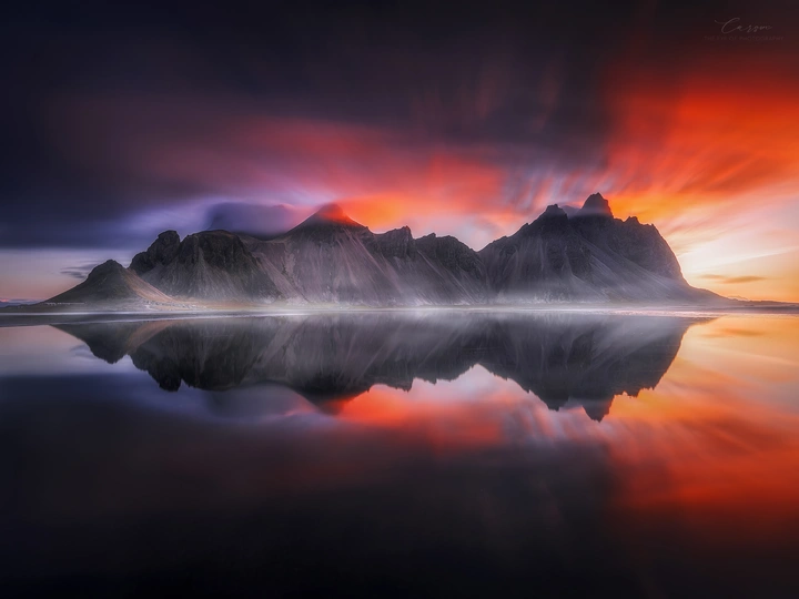 清晨的冰岛总是让人恍惚,这是一个属于光与色彩的奇幻国度。当世界还在半梦半醒中,微光轻轻划破夜幕,天地间弥漫着一抹微妙的宁静。远处那片柔和的彩霞,仿佛一条轻薄的丝绸,静静地披在Vestrahorn的山巅上。风轻轻拂过,山尖的霞光随之流动,像是天地间的一场无声对话。此刻,山河在霞光中苏醒,而我就在这片静谧中,感受到世界的微光。