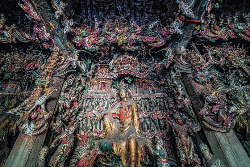 长治观音堂内的泥质彩塑与悬塑,为明代万历年间塑造,现在保存基本完好,雕塑艺术高超精湛,人物刻化细腻逼真。殿堂内四壁及柱、梁、架上处处塑满了神话传说里的人物,大小近千尊的塑像神态各一,栩栩如生,这些塑像仅靠背后的横柱连接,四面悬空,周围祥云环绕,颇有天宫仙境之感。