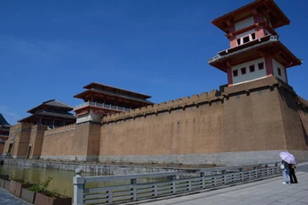蓝天下都匀秦汉影视城仿古建筑阁楼箭楼围墙