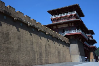 蓝天下都匀秦汉影视城仿古建筑阁楼箭楼围墙