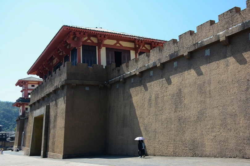 蓝天下都匀秦汉影视城仿古建筑阁楼箭楼围墙
