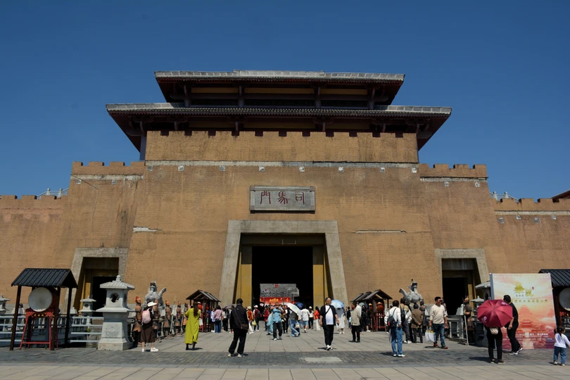 蓝天下都匀秦汉影视城仿古建筑箭楼围墙宫殿