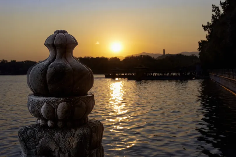 昆明湖畔,暮霭轻笼。汉白玉栏,莲座望柱,皆披夕照之光,熠熠生辉若镀。其栏雕纹精美,望柱耸然,静立湖畔,似诉悠悠往事。 遥瞻天际,玉泉山玉峰塔影绰然,凌于云霄,傲立远方。塔尖染金,与残阳相映,成一轴奇景画卷。湖水悠悠,倒映塔姿,波光潋滟间,似将塔影拥怀。于此凝眸,心驰神往,感余晖之妙韵,叹山川之胜状,逸兴遄飞,沉醉不知返矣。