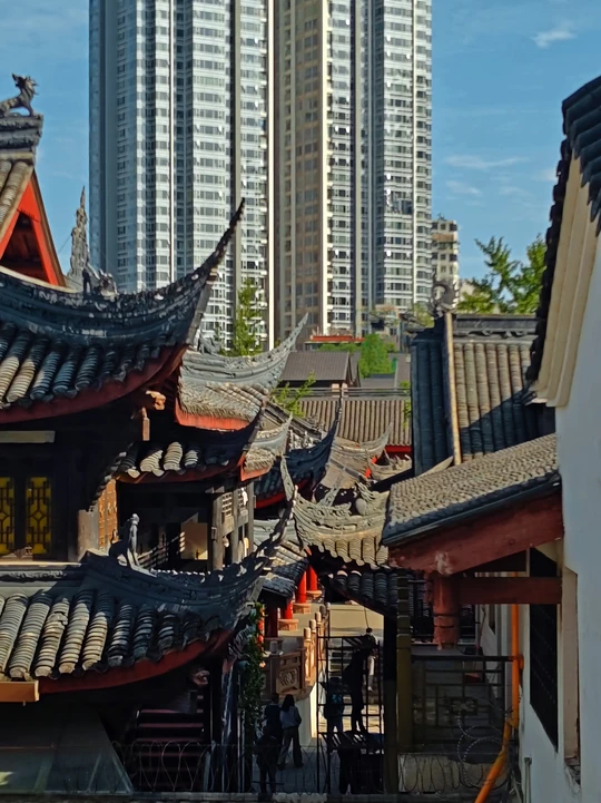 寺庙通常代表着古老的历史、传统的宗教文化和沉淀的精神信仰。它们的建筑风格往往有着浓厚的历史韵味,比如飞檐翘角、青瓦红墙、雕花门窗等,承载着过去岁月的痕迹。而高楼则是现代科技和工业发展的产物,具有简洁的线条、玻璃幕墙、钢结构等现代化元素,象征着快速发展的现代社会。当两者并置时,仿佛是两个不同时空的交汇,形成强烈的视觉和文化冲击,让人感受到时间的流转和时代的变迁
