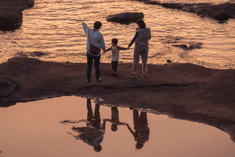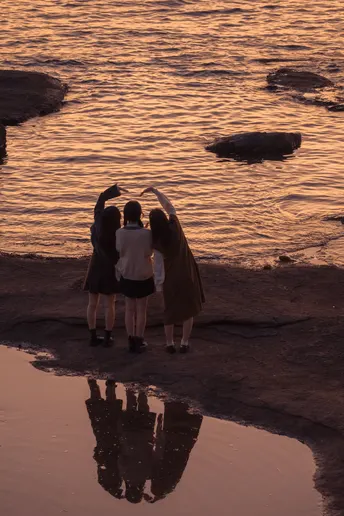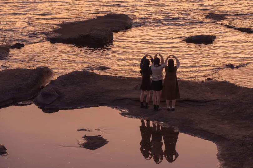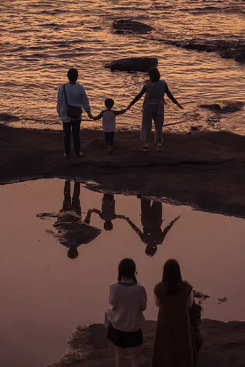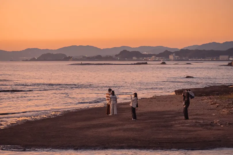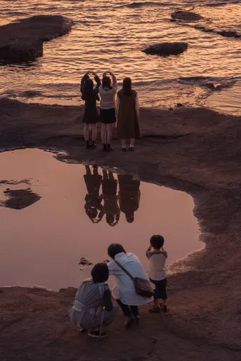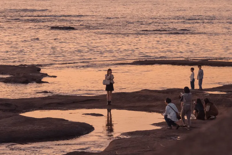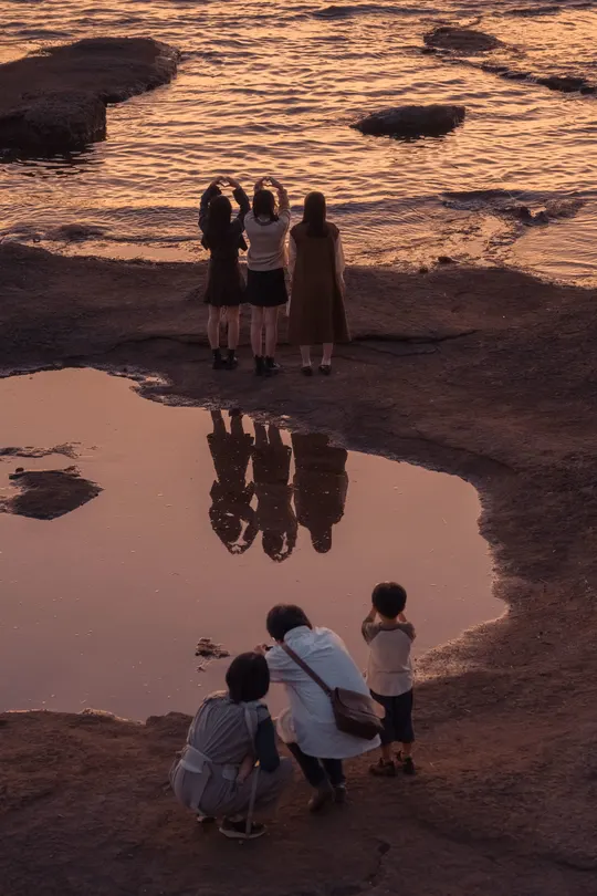 Nikon z7ii|白浜天神崎 夕阳下的海边,一家人遇到三位小姐姐,于是他们开始互相给对方拍照,最后都很开心离去