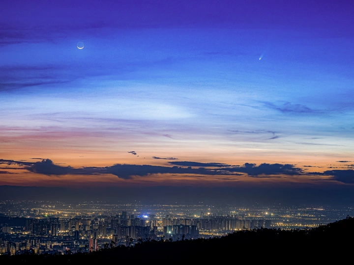 朝霞上1.8%月牙与紫金山阿特拉斯同框