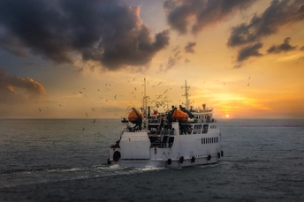 一群海鸟追随着刚刚起锚航行的游船,抢食着船上游客投喂的食物~