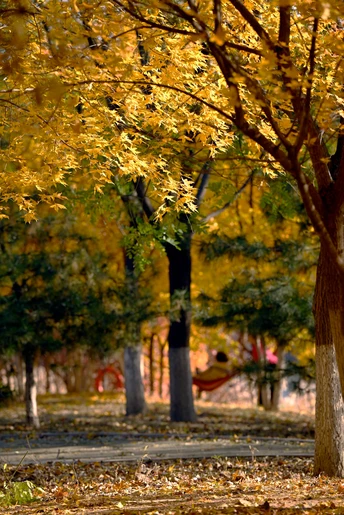 公园枫林被秋阳照的金黄,绿色的松树点缀其中,休闲的女人在吊床中沉浸在金秋美妙的氛围中,生活真美好!