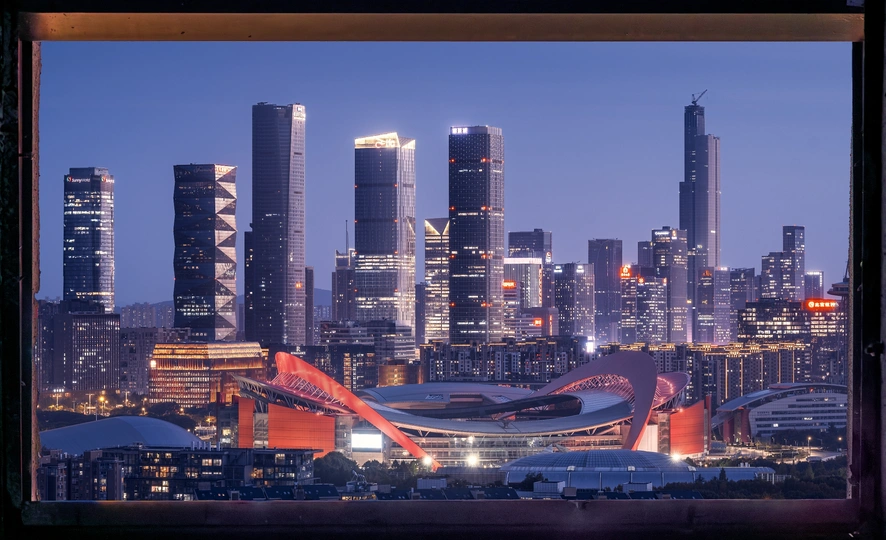 河西CBD位于南京市建邺区河西新城,是华东地区仅次于上海陆家嘴金融贸易区的第二大中央商务区。 在不远处破损的窗户中一瞥河西CBD天际线,金光时刻和蓝调时刻格外迷人。