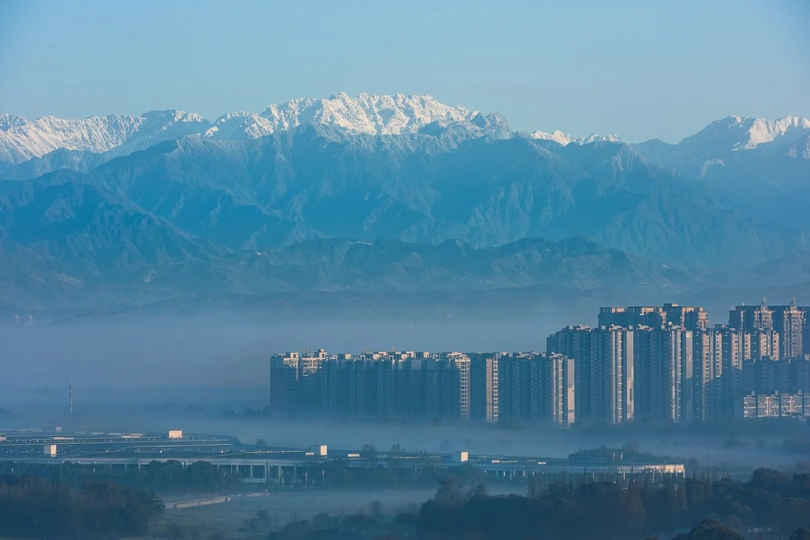 在成都市郫都区远处的雪山和地铁6号线停车场同框