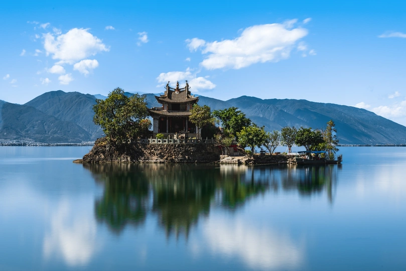小普陀,一座袖珍小岛,静静伫立于洱海 之中, 宛如一颗遗落的珍珠,散发着迷人的光 芒。 岛上庙宇古朴典雅, 香火缭绕, 每一步都 踏着历史的回响。