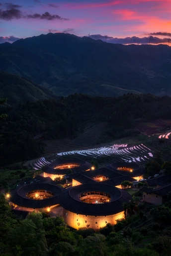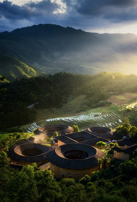 福建土楼产生于宋元,成熟于明末、清代和民国时期.土楼以石为基,以生土为主要原料,分层交错夯筑,配上竹木作墙骨牵拉,丁字交叉处则用木定型锚固.福建土楼或方或圆,以圆为主,如珍珠般洒落在闽西南的绿水青山间.