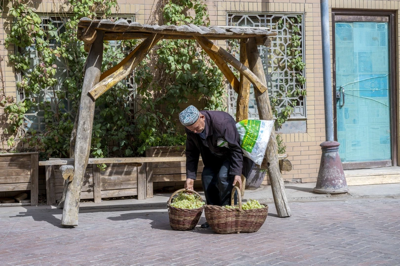 2024年10月拍摄于新疆南疆喀什古城,老汉提装好篮子的葡萄去城中心售卖。