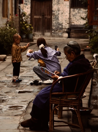 峨眉山脚下的罗目古镇,一位老奶奶安静地坐在木椅上纳着鞋底,显得格外宁静。她的身旁,年轻妈妈正蹲地拍摄,记录下这份岁月静好。不远处,小男孩手比耶字,纯真笑容温暖人心。罗幕古镇的古朴背景,为这幅画面增添了几分韵味。三代人,在同一空间各自沉醉,和谐而美好。这张照片,让我深刻体会到岁月的温柔与生活的美好,每一刻都值得我们用心去感受和珍藏。