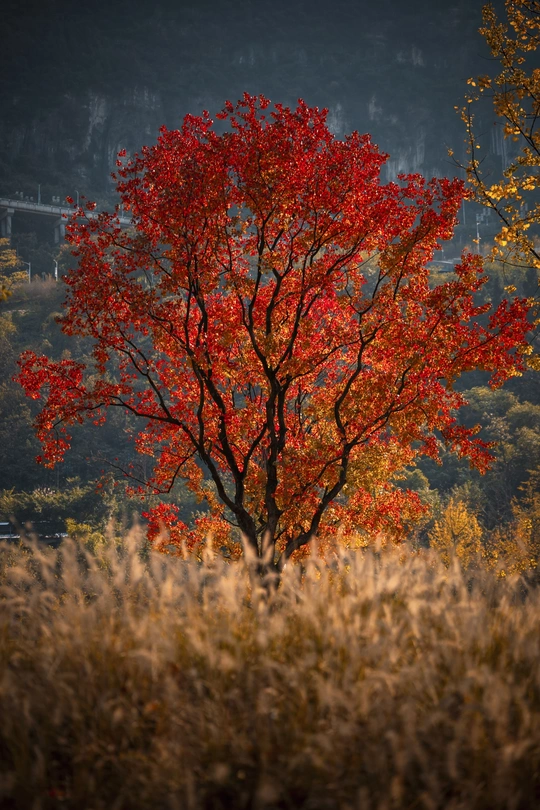 在郎酒庄园闲逛的过程中,路过酒歌广场看到这么一颗红色的树,但是一直找不到合适的角度拍摄,等到快结束行程时,阳光穿过树叶,于是果断按下快门,得到我想要的样子。