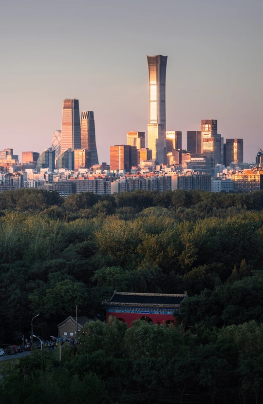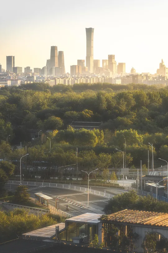 这两张图展示了现代都市与自然景观相融合的场景。画面中,最显眼的是北京的中国尊等标志性建筑,高耸入云的摩天大楼代表着现代的繁华与科技的进步;前景中的茂密树林和古建筑则是天坛公园的古建景观,其飞檐翘角和红墙绿瓦配合郁葱的皇家园林,散发着出古朴的韵味,象征着历史的沉淀与文化的传承。 以“沉浸时间长河,领略不同时代独特魅力”为主题来看,作品体现着新旧交替与融合。现代的高楼大厦象征着当今时代的高速发展和现代化进程,它们是现代科技与经济实力的体现。而古建筑和自然景观则仿佛带我们回到过去,让我们沉浸在历史的长河中,感受古老文化的底蕴和宁静。 这两张图片通过将现代与传统并置,希望让观者能够在一瞬间感受到跨越时间的震撼,体会到不同时代各自的独特魅力,仿佛沉浸在时间的长河之中,既能触摸到历史的厚重,又能感受到现代的活力。