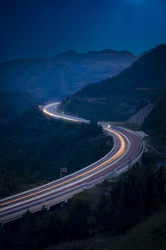 夜幕低垂,巍峨的山峦如同沉睡的巨人,默默守护着脚下这条流动的光河。车灯划破夜空,留下跃动的光轨,仿佛在与山峦的静默进行一场无声的对话。