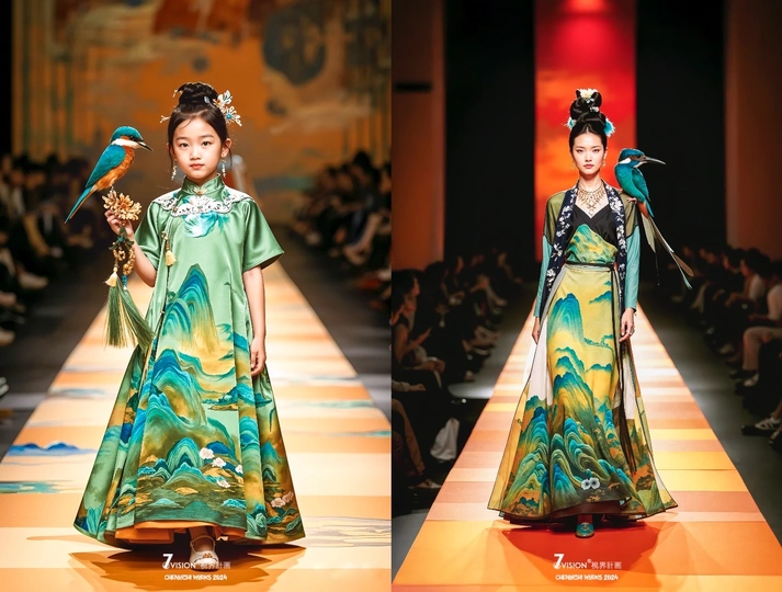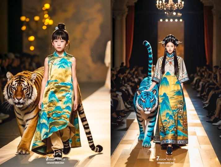 本次创作灵感来自宋代画师王希孟的“千里江山图”, 其蓝青色的配比,飘逸自由的笔法尽显作者天才之姿,于是我们用数字艺术将画意服饰化、搭配流行当下的时尚秀场,并以虎、孔雀、犬,飞鸟等自然生灵点睛氛围,于是一场别开生面的演绎就在眼前,瑾以此片来赶赴这场千年之约~