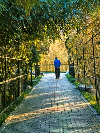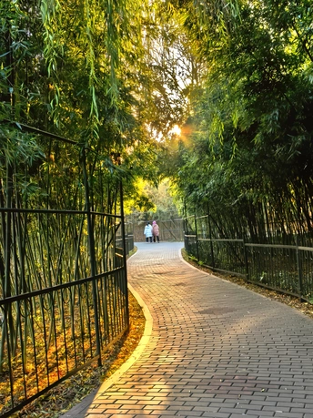 在济南泉城公园的竹林入口处,拍摄了夕阳下入口处的小男孩,表现冬日的光影和男孩的动态。