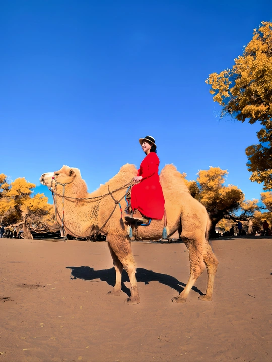 在额吉纳胡杨林拍摄了骑骆驼的女子,表现了色彩对比和秋日氛围。