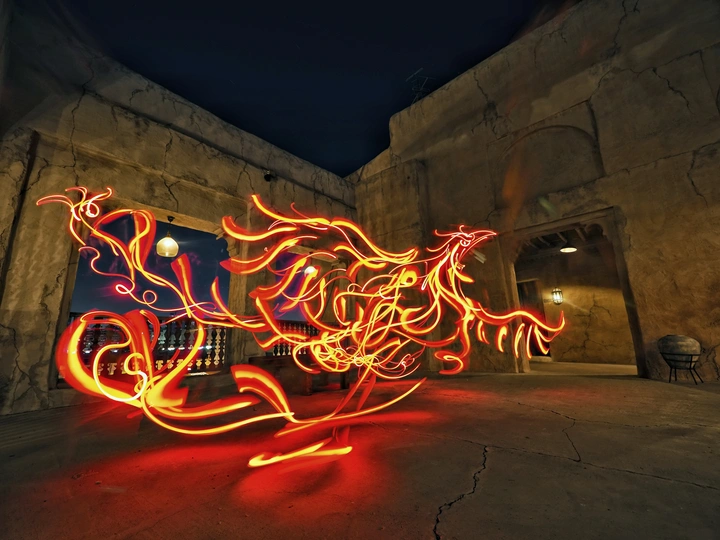 在迪拜的老城区Al Seef,飞舞的凤凰从天而降! 阿拉伯书法笔触融合中国风光绘图腾创作,该作品即将在阿联酋首都阿布扎比中阿建交四十周年艺术展中展出。