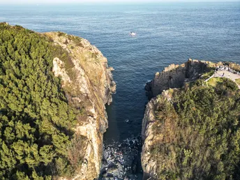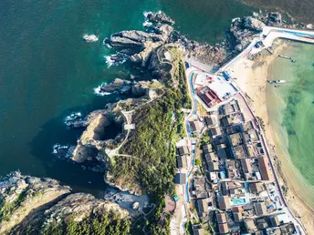 仙人井位于福建省福州市平潭县流水镇东美村东海仙境景区内 景观特色:是一个巨大的天然海蚀竖井,井深约43米,井口直径约50米,井中狂涛雷鸣海啸,惊天动地,为平潭十景之一 。地质成因:是各种海蚀综合作用形成,3组4个海蚀洞在仙人井交汇,形成规模较大的海蚀掏空区,致使上部岩层垮塌、冒落直至冒顶
