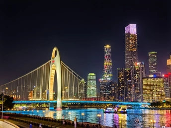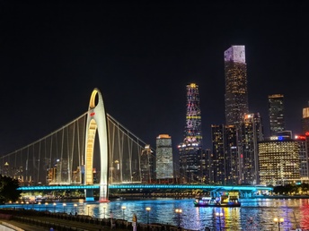 夜幕降临,在琶醍拍摄城市灯光下的珠江新城和猎德大桥